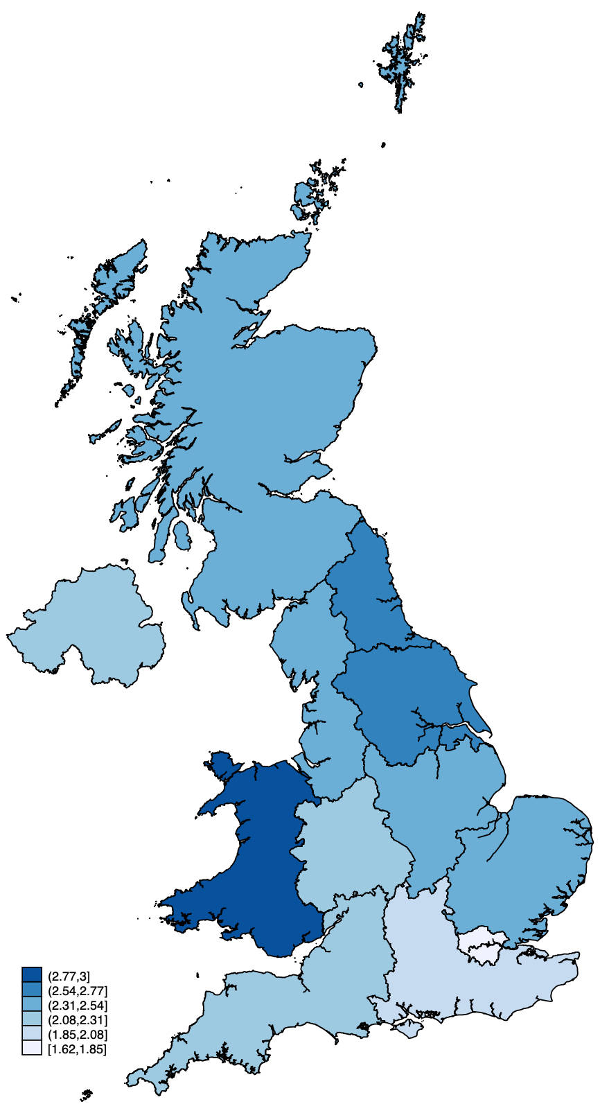 Using data from the Annual Population Survey we find that the regional picture in 2023 shows a striking pattern. Wales has the highest average sickness absence rate – the ratio of hours reported as absent due to sickness to contracted hours – at 3.2%, followed by a number of regions in northern England. By contrast, London (1.6%) and the South East (2.0%) have the lowest sickness absence rates.
