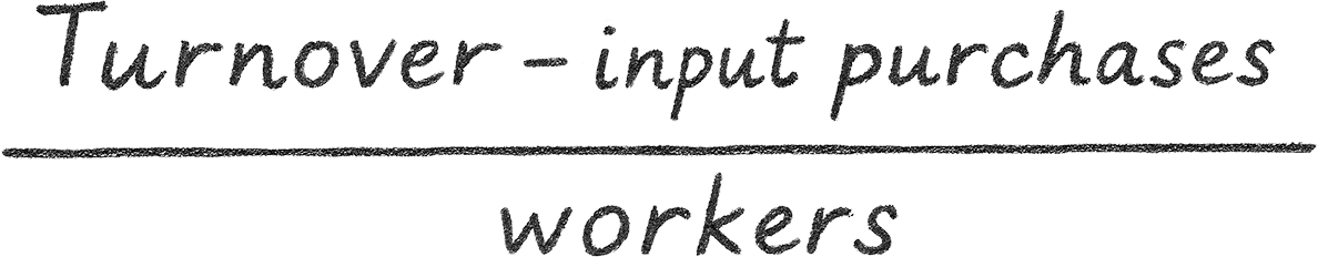 Measure your labour productivity using just three numbers. The annual value of turnover (sales), purchases of inputs (the cost of inputs that are used up in the production process, excluding labour) and the number of people employed.