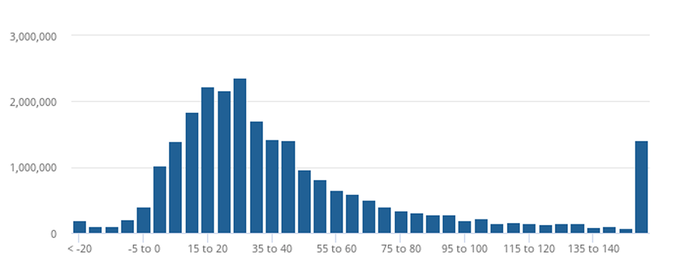 Figure 1: Most workers are in firms around the median productivity, however there are many workers in a long tail of highly productive businesses.