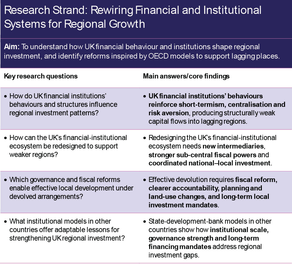 The research outlines reform options, including redesigned governance frameworks, improved local financial intermediaries, and coordinated public–private investment platforms to enhance capital flows and long‑term productivity growth across UK regions.