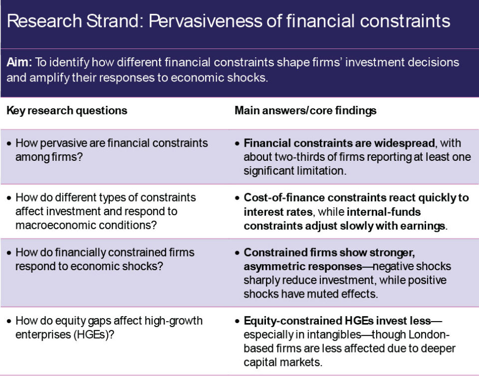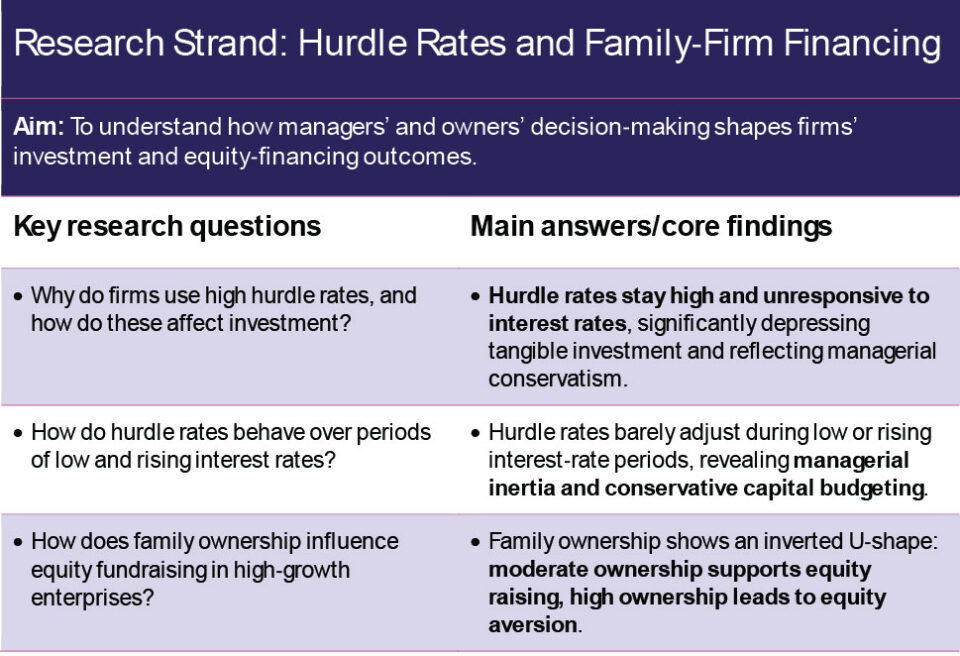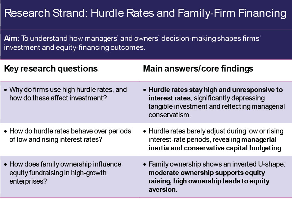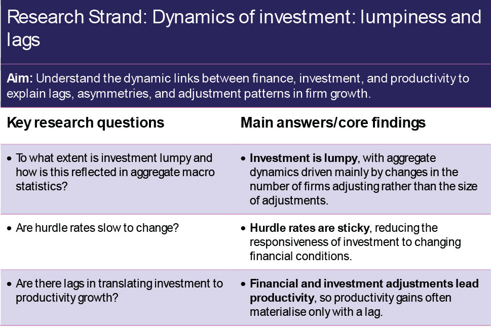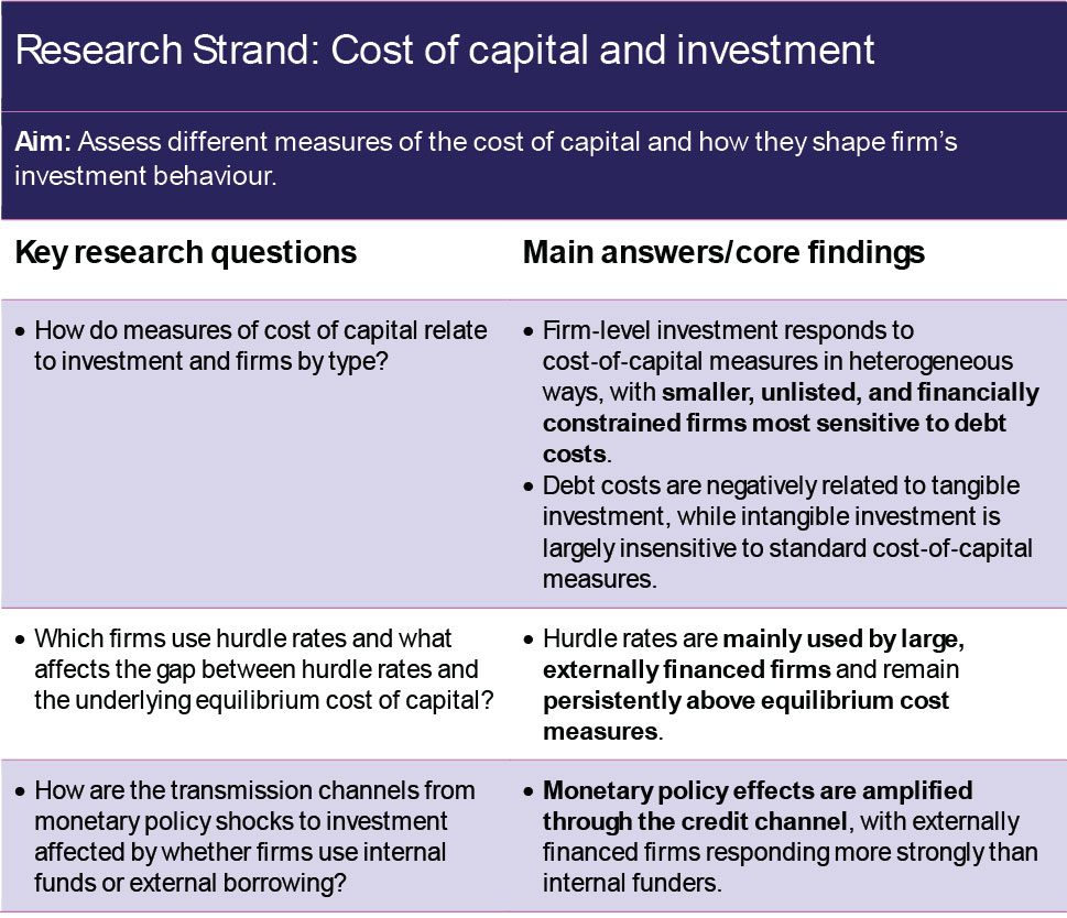 Research undertakings in this programme focus on the cost of capital and investment, including an assessment of different measures of the cost of capital (debt, equity, weighted average cost of capital (WACC), hurdle). The work investigates how those are related to investment of different types (tangible vs R&D). How the firm’s balance sheet evolves when investment is lumpy is relevant. The work shows that investment outcomes vary by firms of different employment size, high-growth designation, productivity, financial constraint, region, and with different ownership structures (particularly considering the family owner).